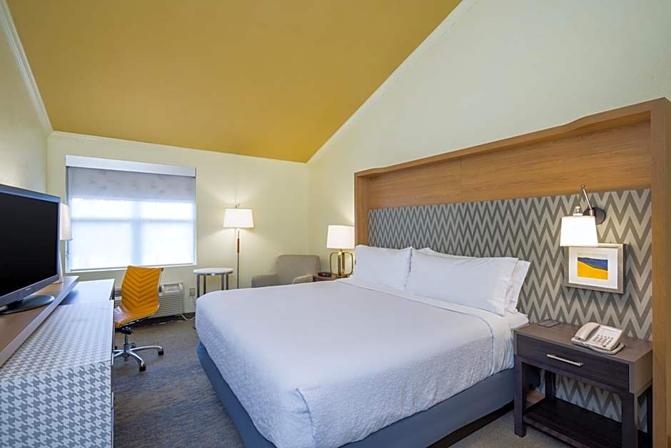 This room features a king bed, a desk, chair with ottoman, Kuerig coffee maker, refrigerator and in room safe.
